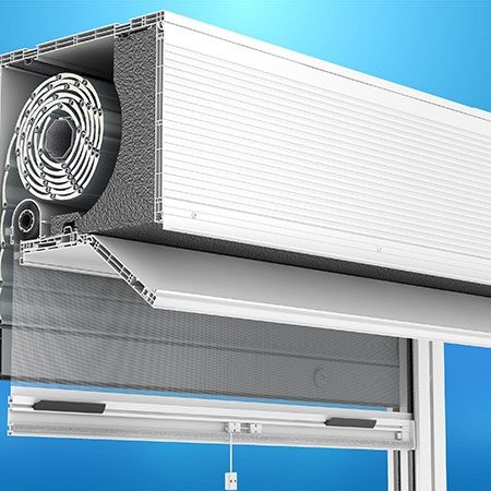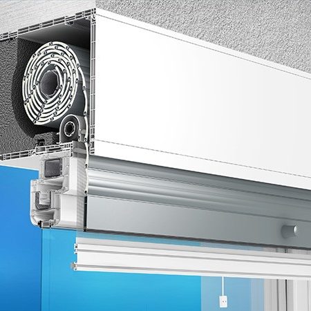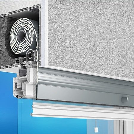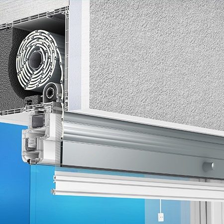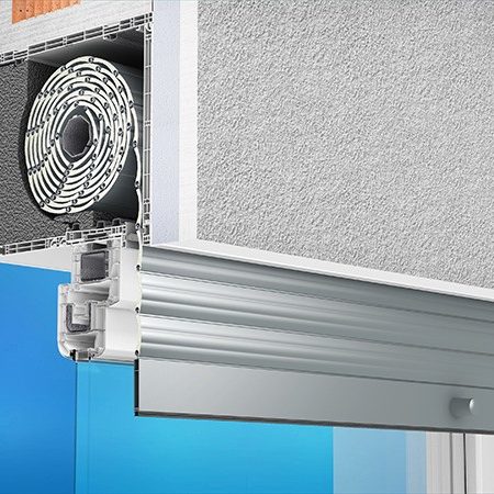 Um besseres Aussehen zu erzielen, ist das Stirnprofil außen glatt. In diesem Einbausystem befindet die Revisionsklappe sich auf der Unterseite und der Rollladen wird vom Innenraum bedient.