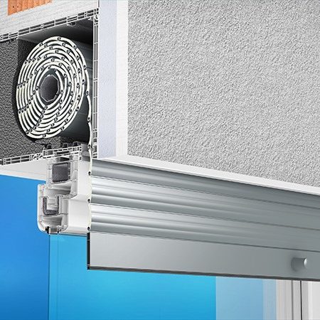 In diesem Einbausystem befindet die Revisionsklappe sich auf der Unterseite und der Rollladen wird vom Innenraum bedient.